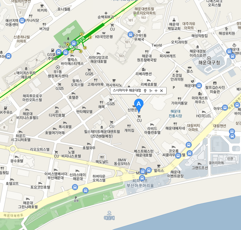 위치는 위의 사진처럼 지하철 역에서 바닷가로 가는 길을 구남로라고 부르는데 중앙 쯔음에 있습니다.